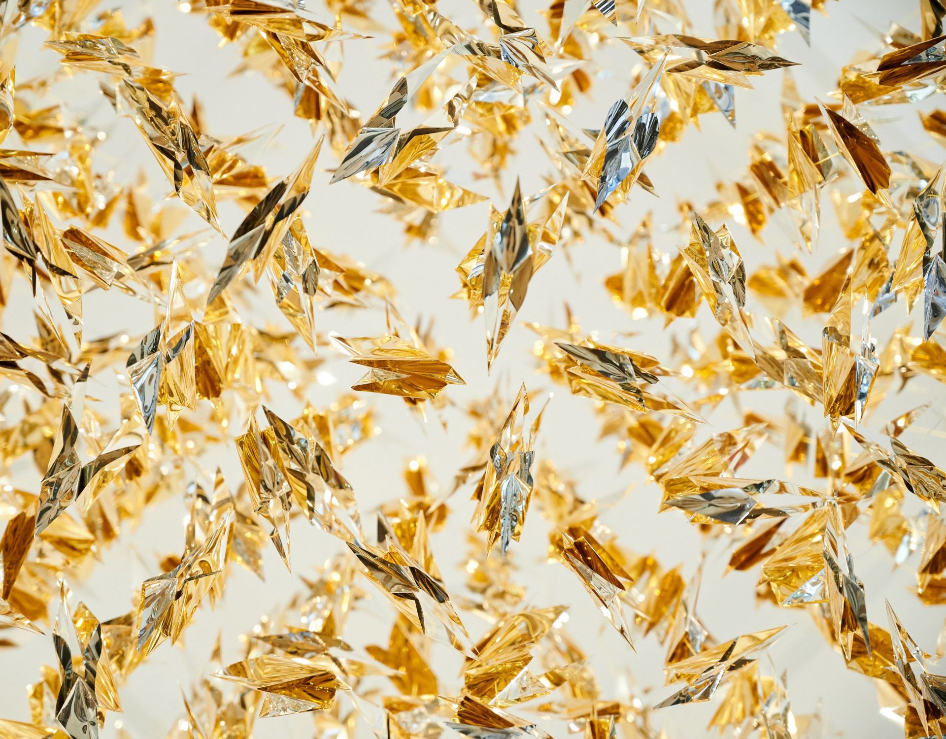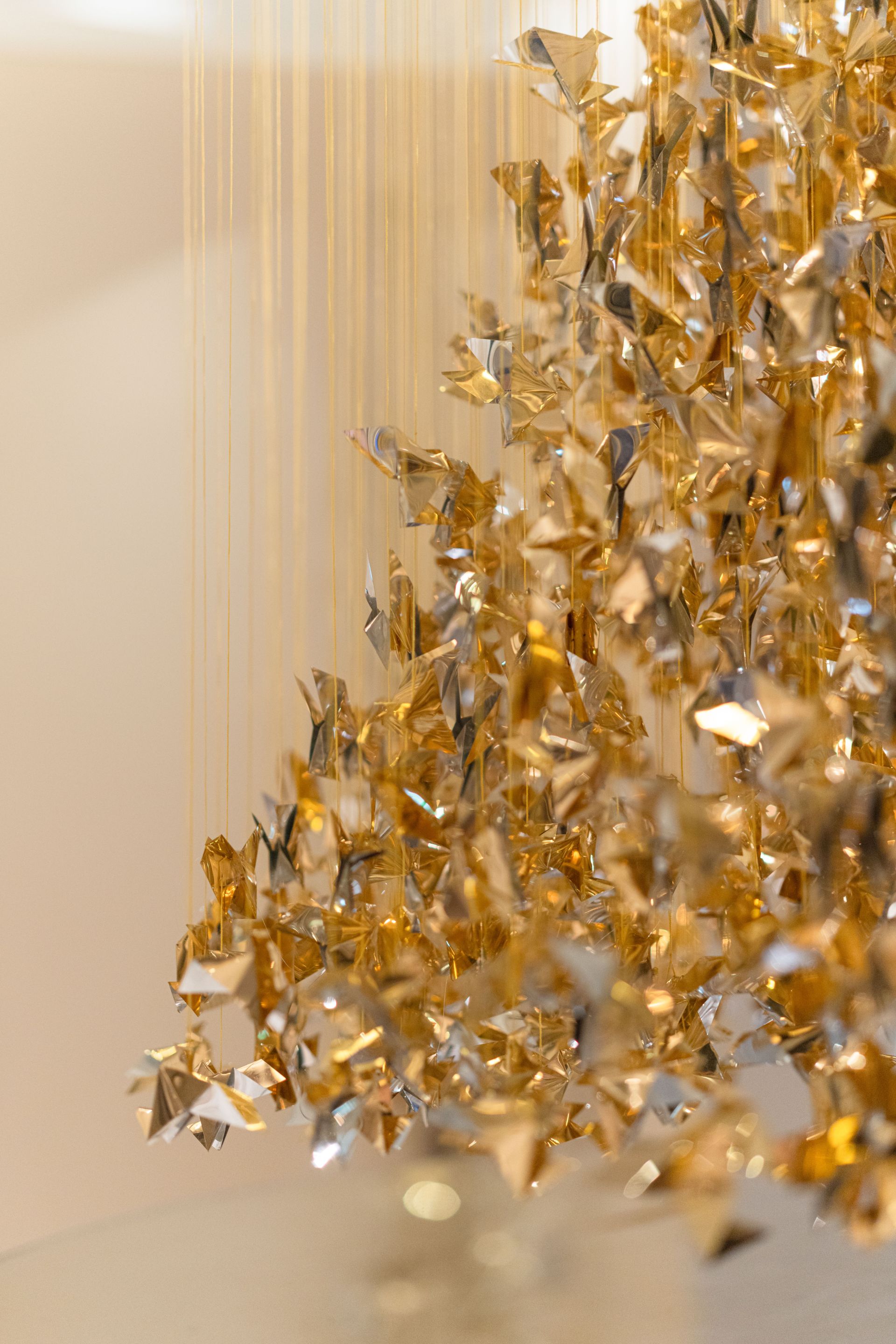 “For the spa of the Dolder Grand in Zurich, golden doves rise up to form a contemporary Christmas tree. Floating from the ceiling, it unfolds its effect in the slightest breeze, in the steps of a guest – a delicate shimmer sets it in motion, like a softly murmuring swarm. 1,200 hand-folded origami doves create an image of peace. The gold of the birds represents thoughts, dreams, and projects that will take shape in the new year – a symbol of infinite creative potential. Carried by red threads, this installation lends strength and joy to the festive season.”