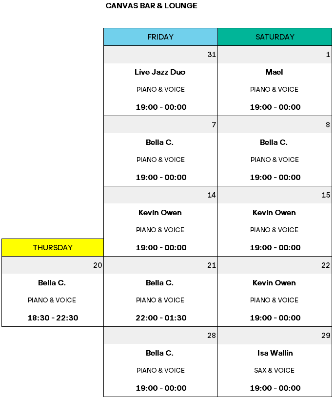 Be inspired by the changing line-up in the Canvas Bar & Lounge and enjoy a stylish musical atmosphere featuring elegant piano sounds and fine jazz.