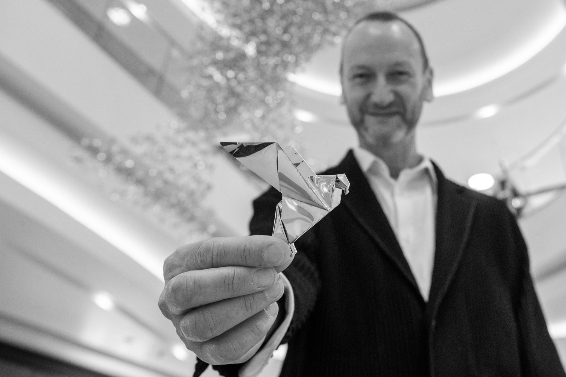 Kaisin, international bekannt für seine Arbeiten zwischen Design, Kunst und Architektur, integriert Origami als zentrales Element seiner Kunst. Mit seiner Installation im Dolder Grand schafft er ein festliches Sinnbild voller Leichtigkeit, Frieden und Inspiration.
